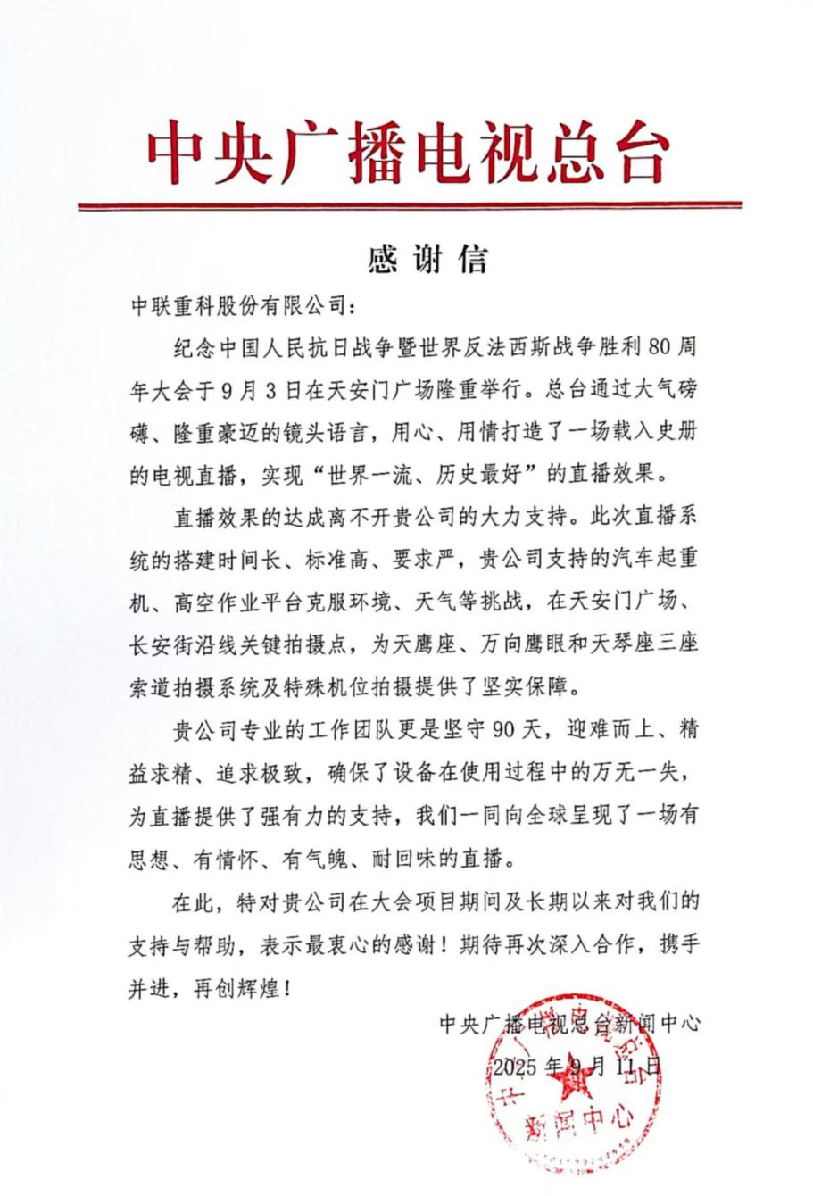 “最衷心的感謝”!央視總臺致信盛贊中聯重科保障九三閱兵直播