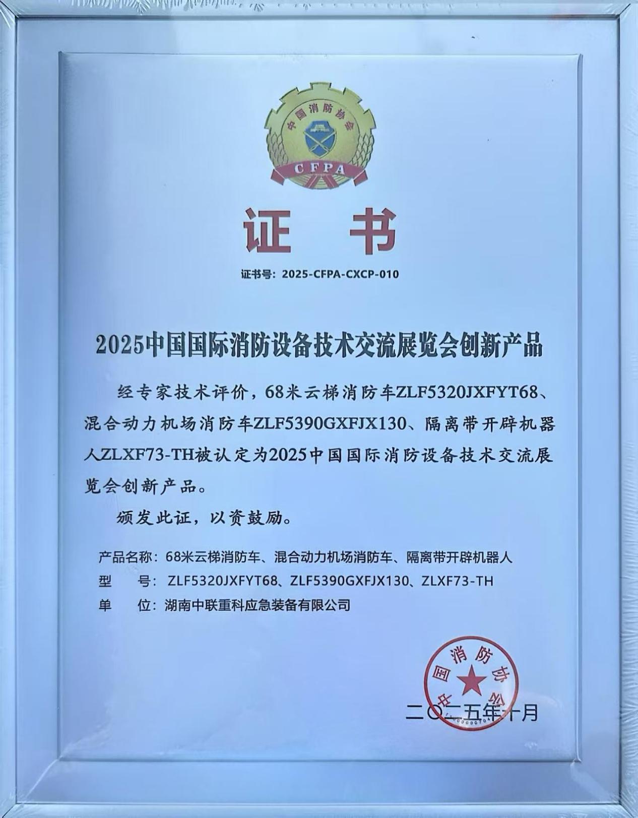 展會首日開幕式上,中聯重科三款應急裝備還榮獲了中國消防協會頒發的創新產品獎。