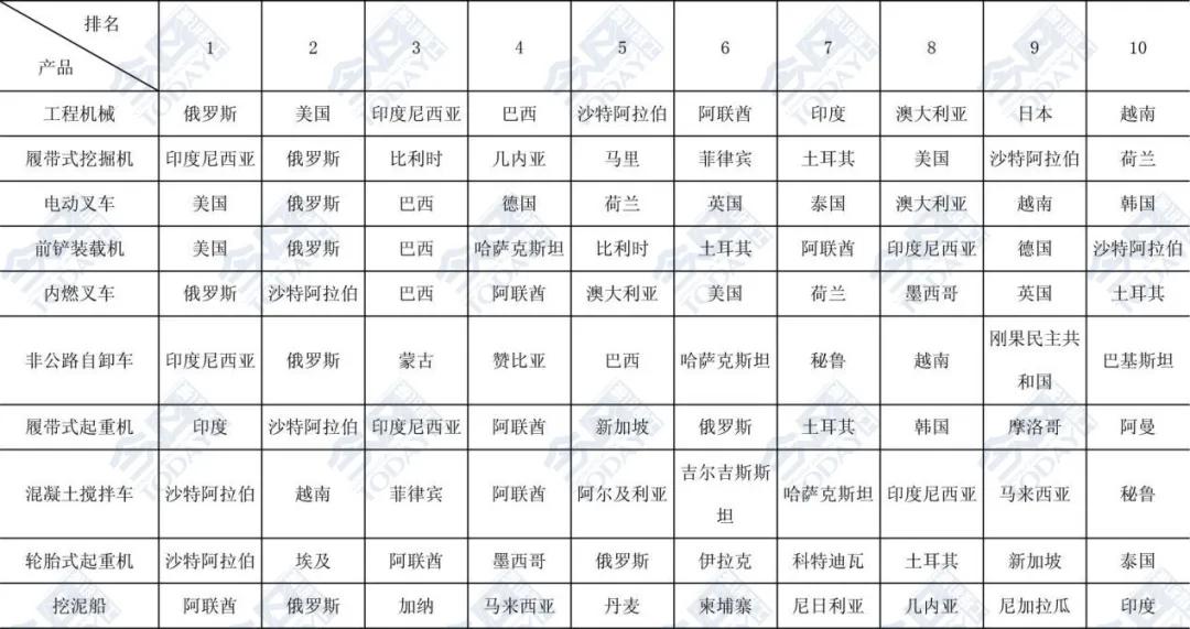 表1 2025年1-9月主要工程機械產品出口金額排名前十位國家和地區