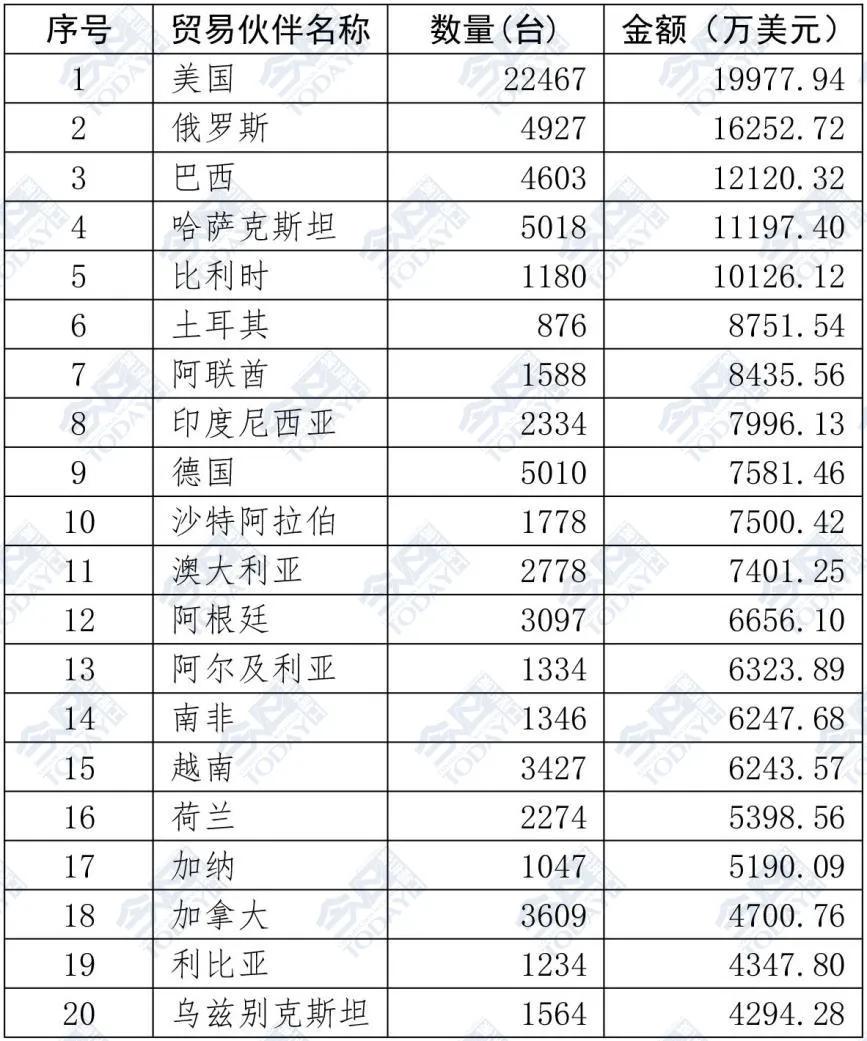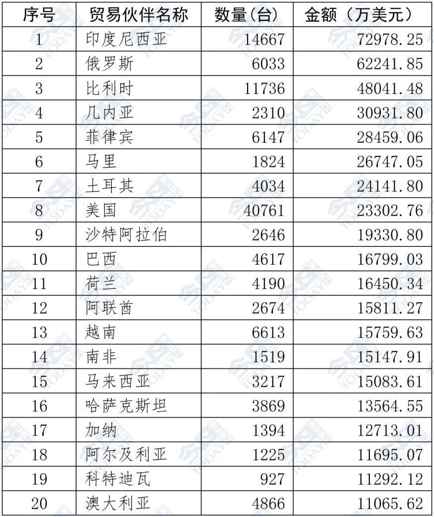 表2 2025年1—9月挖掘機出口額排名前二十位國家和地區