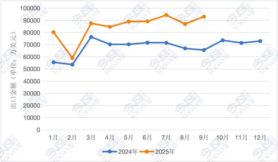 從環比情況來看,9月我國挖掘機出口情況整體呈上升趨勢。2025年9月我國挖掘機(含履帶挖掘機和輪式挖掘機)出口總額達9.30億美元,較8月的8.70億美元上升6.90%。2025年9月較2024年同期的6.55億美元同比增長41.90%。