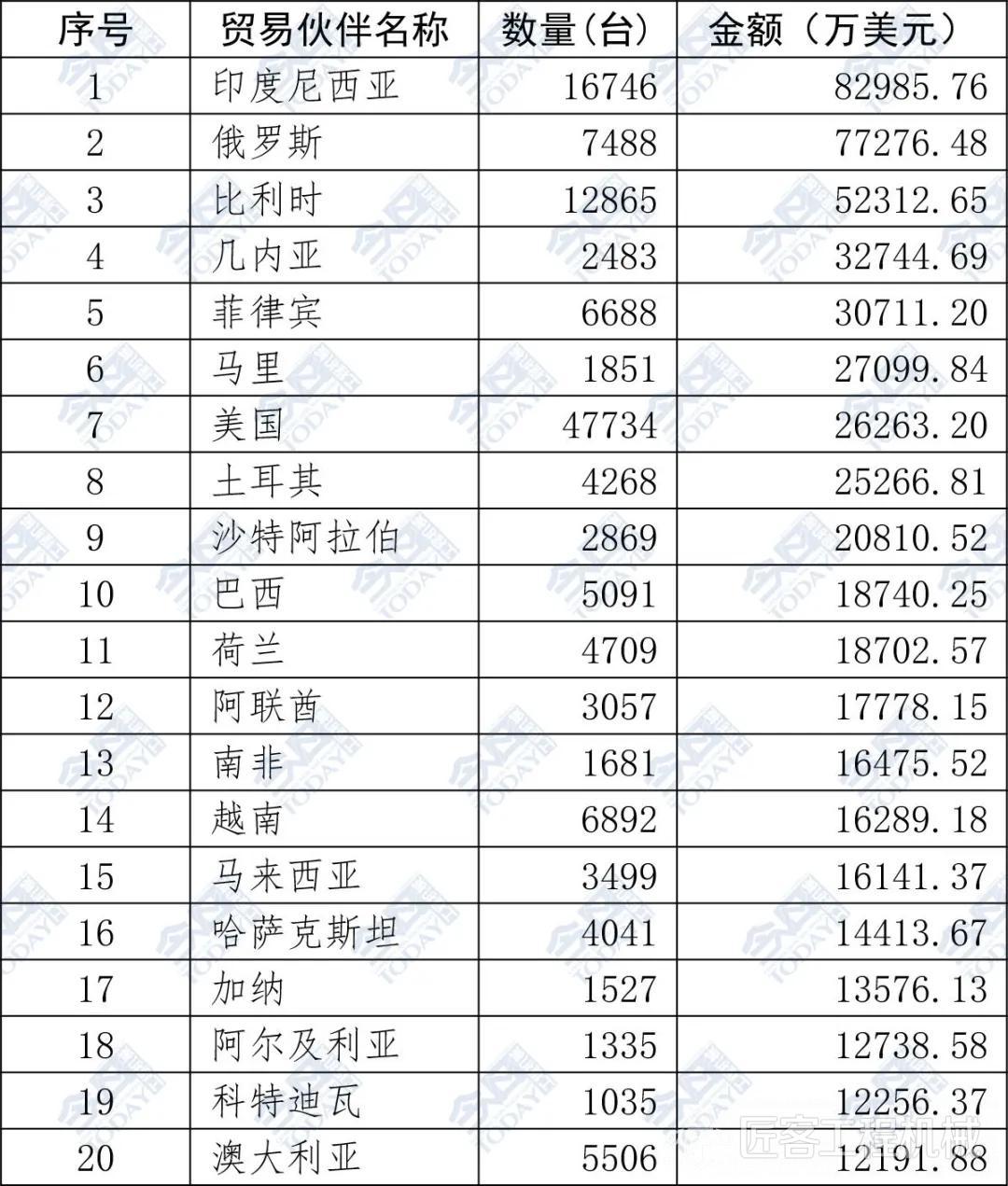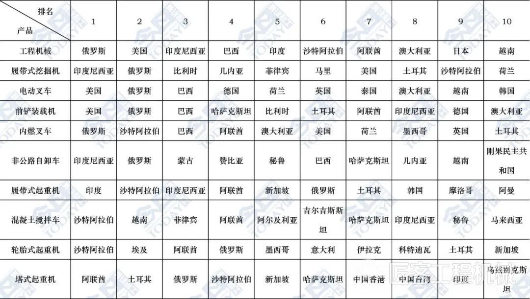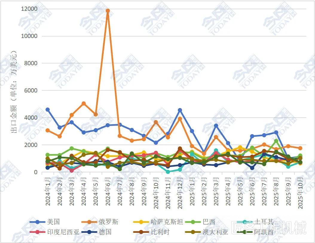 從2025年1—10月主要工程機(jī)械產(chǎn)品進(jìn)出口貿(mào)易情況來看,對俄羅斯、美國、印度尼西亞出口金額排名位列前三。