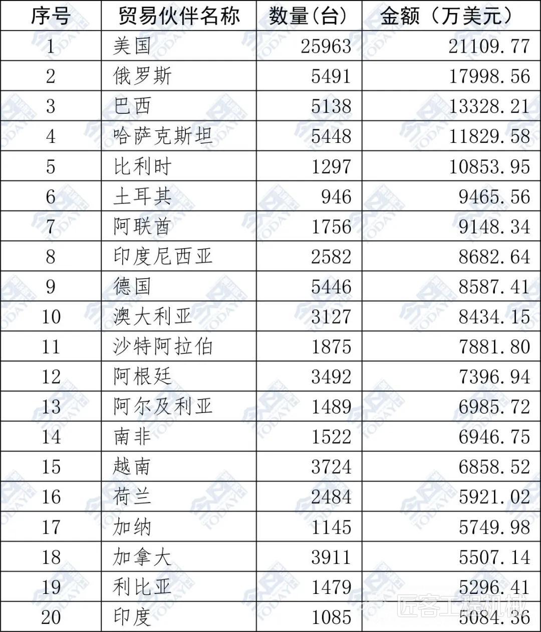 表2 2025年1—10月挖掘機(jī)出口額排名前二十位國家和地區(qū)