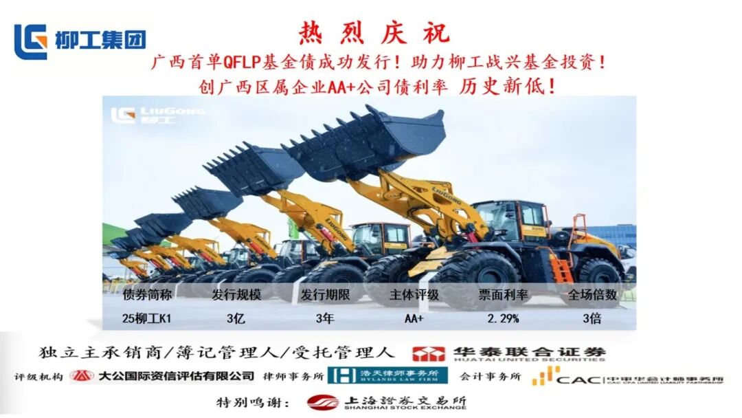 12月11日,柳工集團2025年面向?qū)I(yè)投資者公開發(fā)行科技創(chuàng)新公司債券(第一期)在上海證券交易所成功發(fā)行。本次債券發(fā)行金額3億元,期限3年,發(fā)行利率2.29%,全場倍數(shù)3倍,為廣西首單QFLP(合格境外有限合伙人)基金債,創(chuàng)下廣西區(qū)屬企業(yè)AA+公司債利率歷史新低,也刷新了柳工集團自身債券發(fā)行利率記錄。