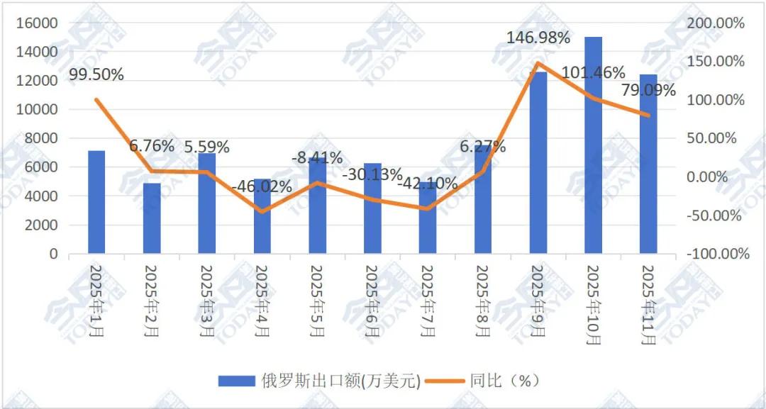 圖2 2025年1-11月我國挖掘機對俄羅斯月度出口額及同比情況