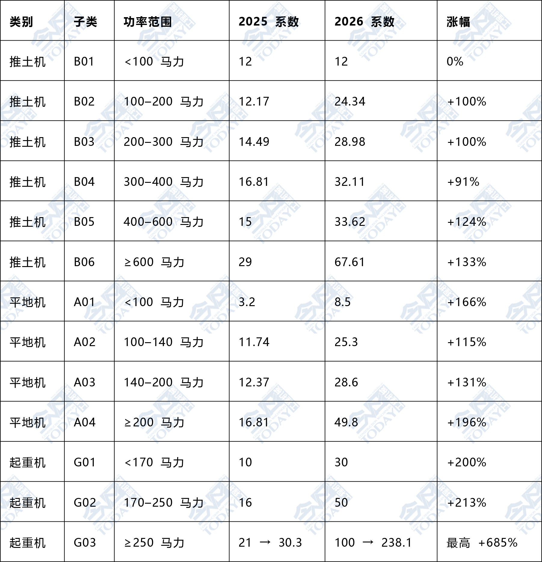 此外,推土機、平地機、起重機等主要工程機械品類的報廢稅系數也普遍翻倍。其他相關主要工程機械品類別稅率變化見表2。
