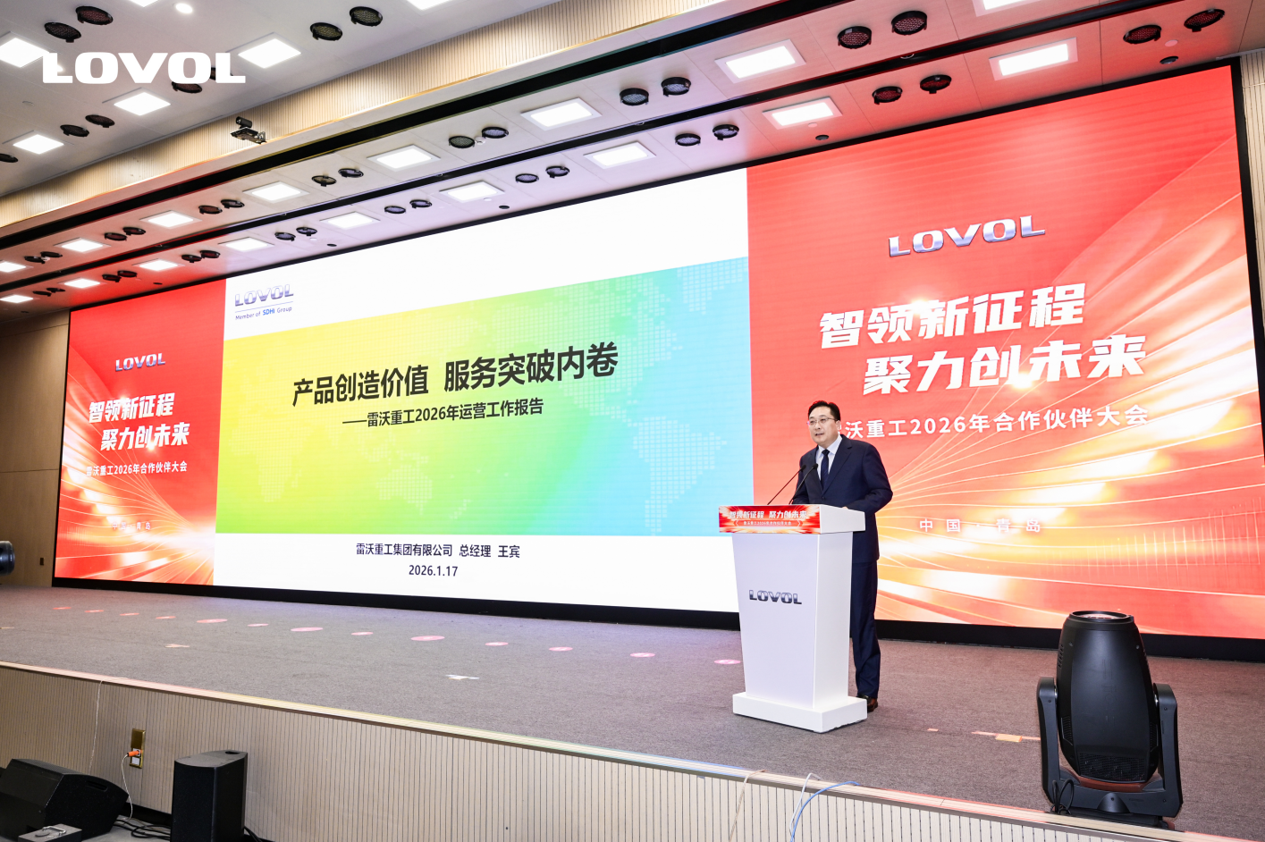 1月17日,以“智領新征程 聚力創(chuàng)未來”為主題的雷沃重工2026年合作伙伴大會在青島舉行。會上,雷沃重工黨委書記、董事長郎俊宇出席大會并致辭。雷沃重工總經(jīng)理王賓作年度工作報告。來自全國各地的合作伙伴齊聚雷沃,共話過往收獲,共享市場機遇,共繪未來藍圖。