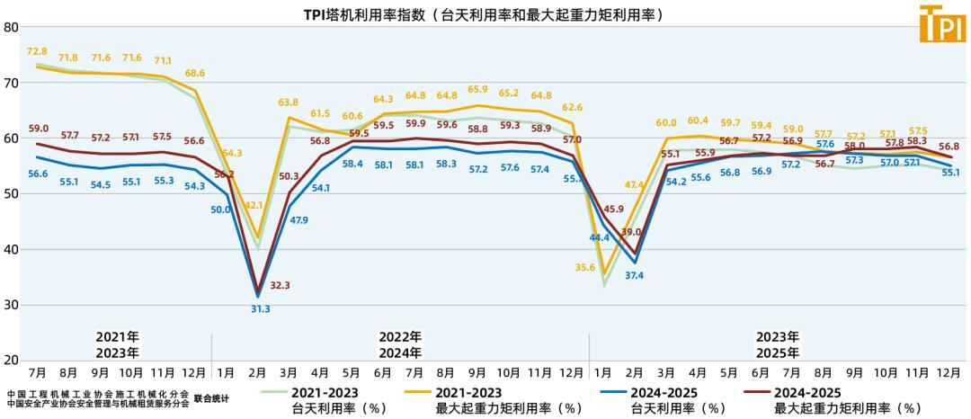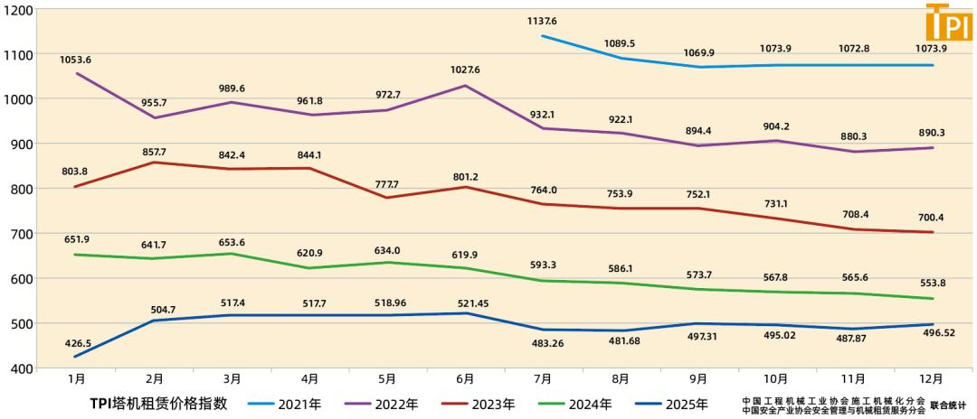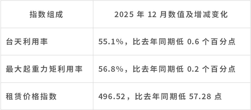 據(jù)中國工程機(jī)械工業(yè)協(xié)會施工機(jī)械化分會等統(tǒng)計的塔機(jī)租賃行業(yè)景氣指數(shù)(TPI),2025年12月份塔機(jī)臺天利用率55.1%,最大起重力矩利用率56.8%,分別較上月低2個百分點和1.5個百分點;12月份租賃價格指數(shù)為496.52點,較上月低5.65點,低于去年同期57.283點。