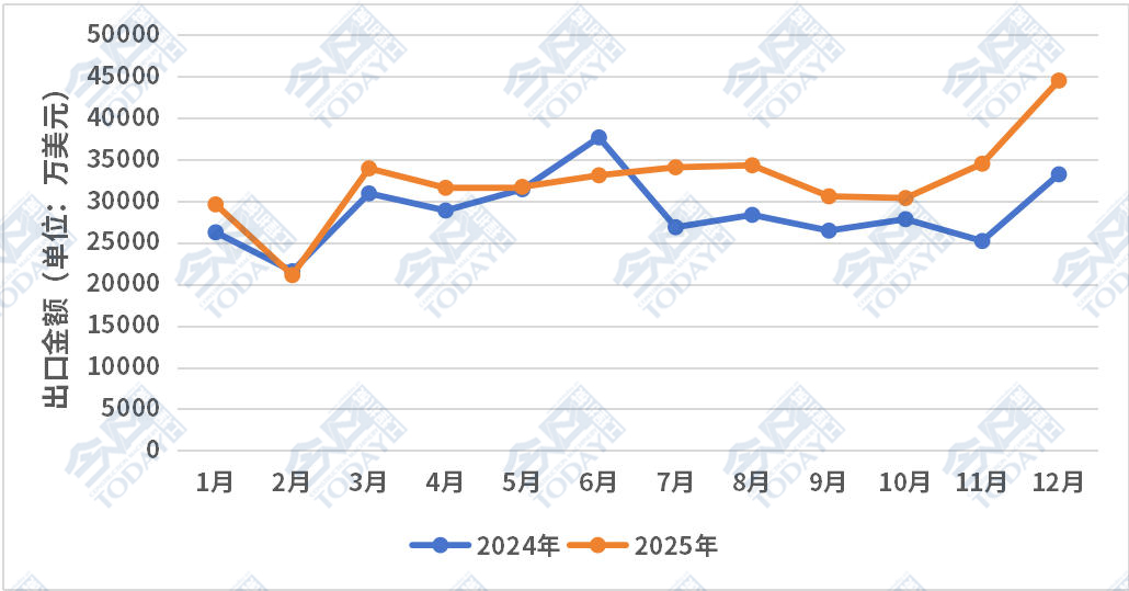 從累計出口額前十的國家來看,馬里雖然在2025年全年整體出口額中僅排在第七,但是其在12月表現十分亮眼,環比大幅增長269%,擺脫了此前數月的溫和態勢。同時巴西同比表現也十分突出,與上年同期相比增長182.85%。